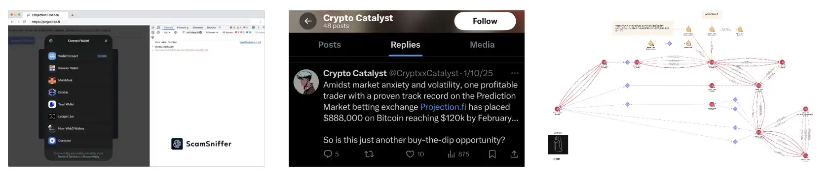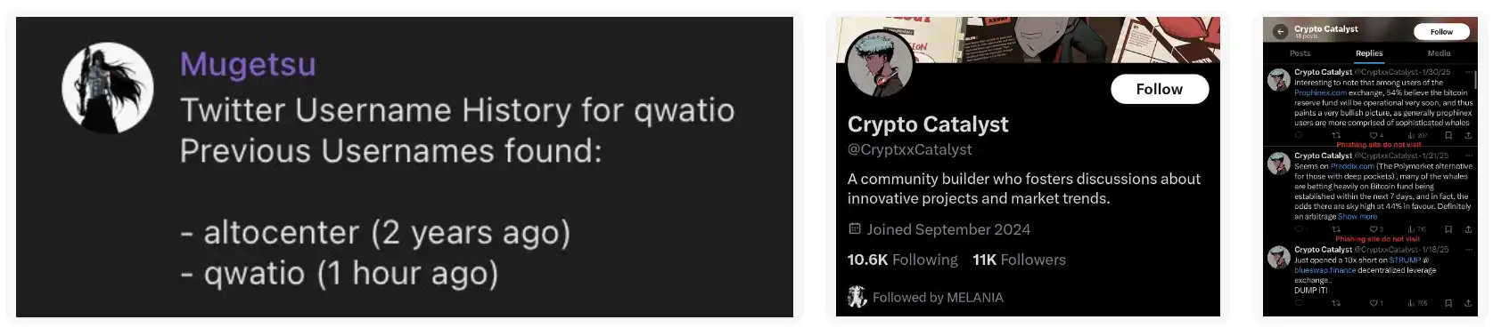我看到他们关注了 @CryptxxCatalyst,这个账号发布了多个钓鱼网站的链接,并且回复了一些人,试图欺骗他们。