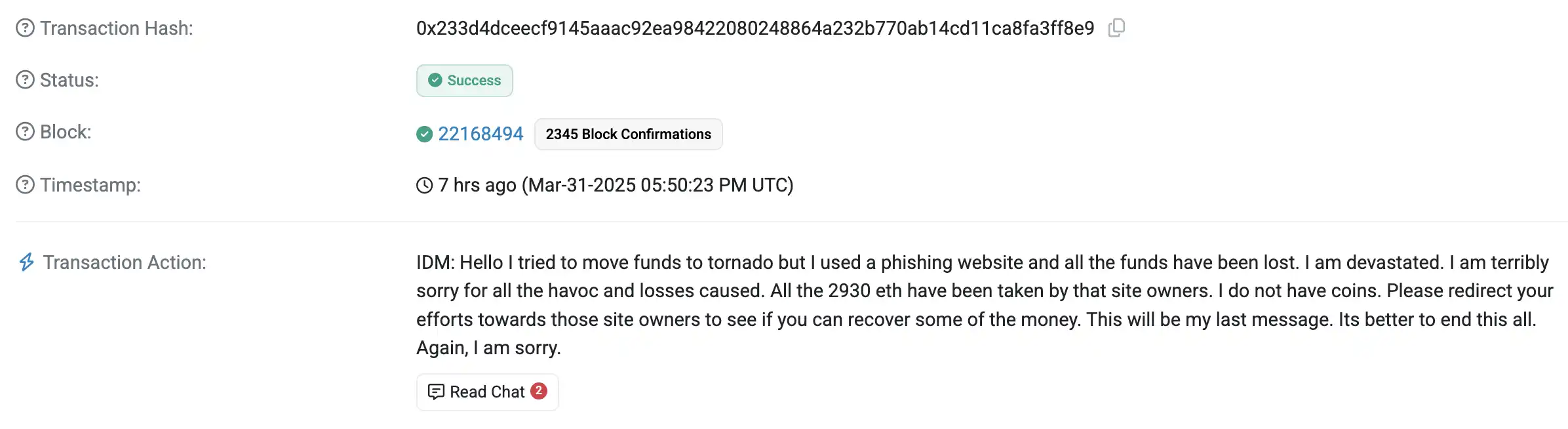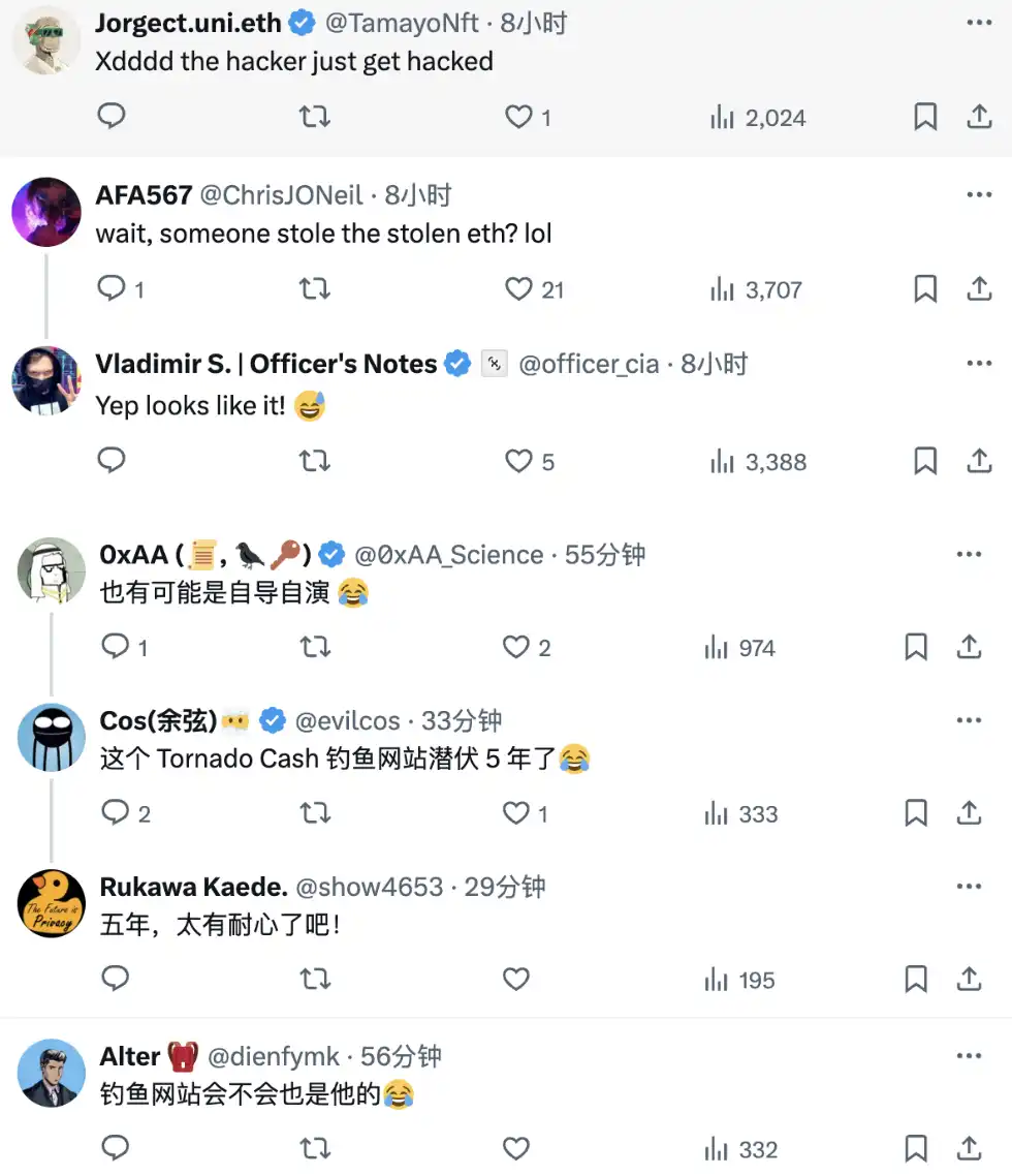 就在所有人以为这笔巨款已石沉大海时,4 月 1 日,慢雾创始人余弦爆料了一则戏剧性转折:黑客改用 Tornado Cash 进一步混淆资金流向,却误点了一个伪装成 Tornado Cash 的钓鱼网站,结果 2930 枚 ETH 被一扫而空。