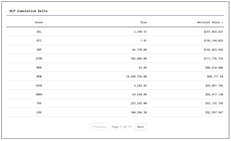 在累计净头寸表中,我们聚合所有 HLP 子金库头寸,展示 HLP 对特定头寸/资产的净敞口。可按各金库的**名义头寸排序。