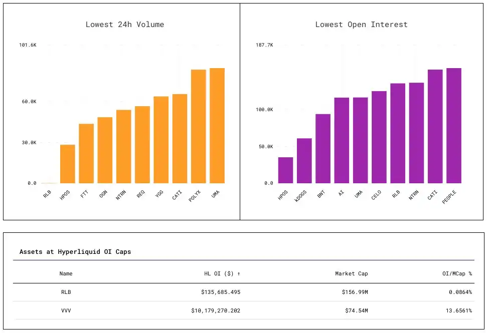· OI/市值比率:未平仓合约除以市值,以百分比表示。该比率有助于识别 Hyperliquid 上可能相对于**流通量过大的市场,存在**纵风险。例如,HLP 清算金库继承的头寸超过 JELLY 流通量的 40%。