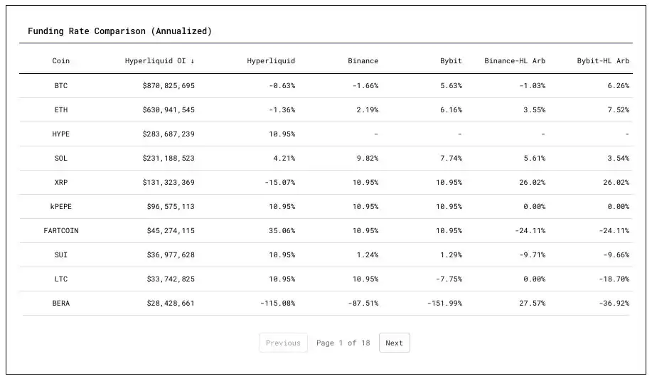 · 资金费率(HL、Binance、Bybit):交易者持有头寸需支付/收取的年化百分比费率。
