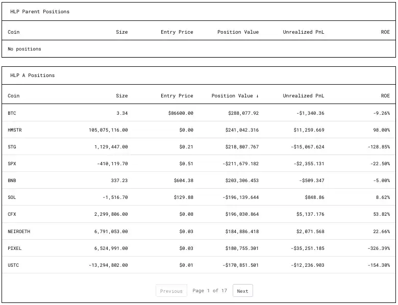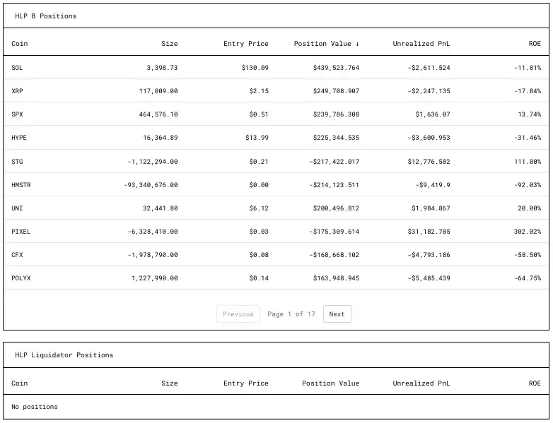 · HLP 母金库似乎持有闲置 USDC,而子金库 HLP-A 和 HLP-B 有活跃的市场做市头寸。