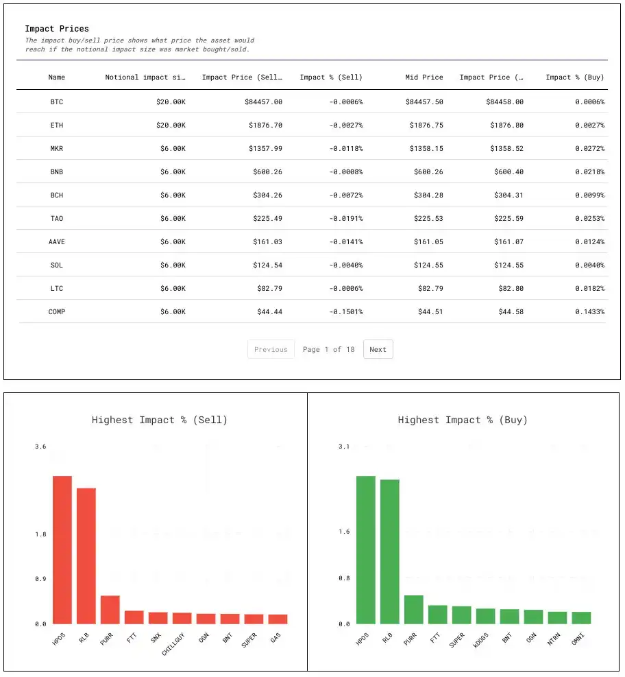 · 冲击百分比:与当前价格的百分比变化。此指标让我们概览 Hyperliquid 上资产的流动性,从而识别易**纵的资产。