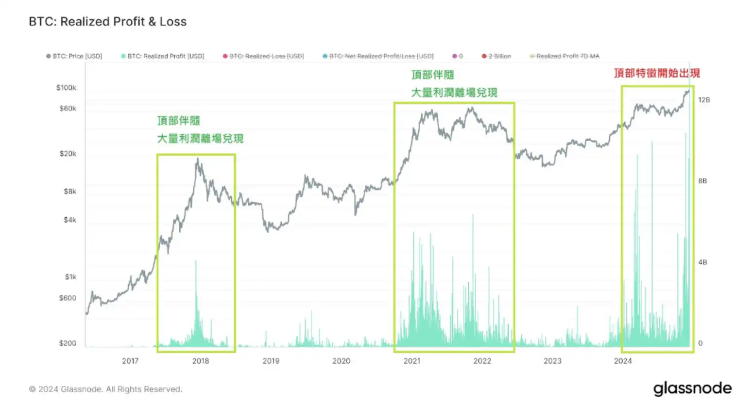 当大量的 低成本筹码持有者,都将手中的 BTC 进行抛售时,我们就会在图表上看到聚集性的巨量已实现利润。