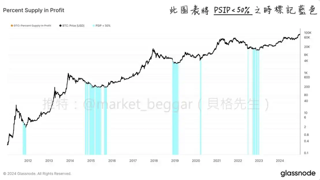 如下图所示,历史上 $BTC 在 PSIP < 50% 的时间点被标注出来,可以看出**时机还是非常精准的