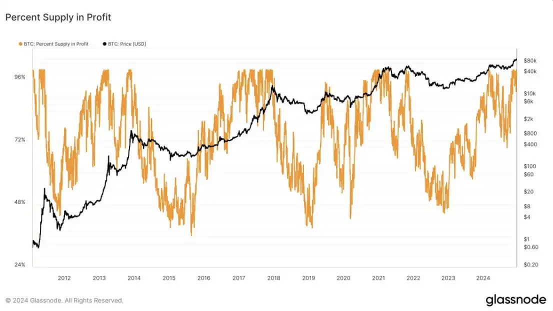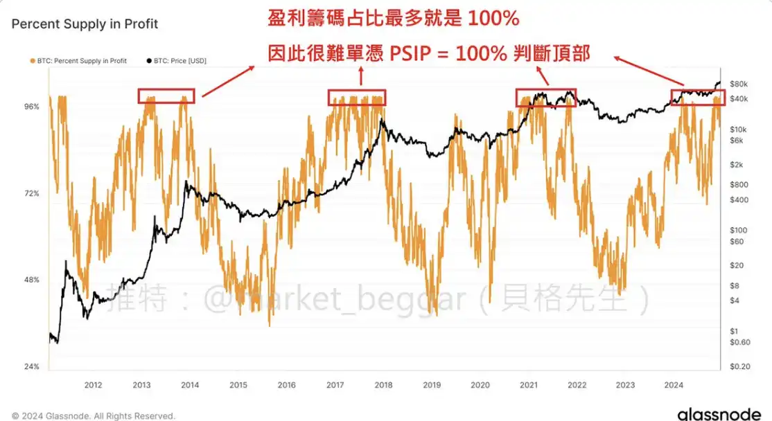 如下图所示,盈利筹码占比**值是 100%,因此仅凭高 PSIP 很难直接判断顶部。