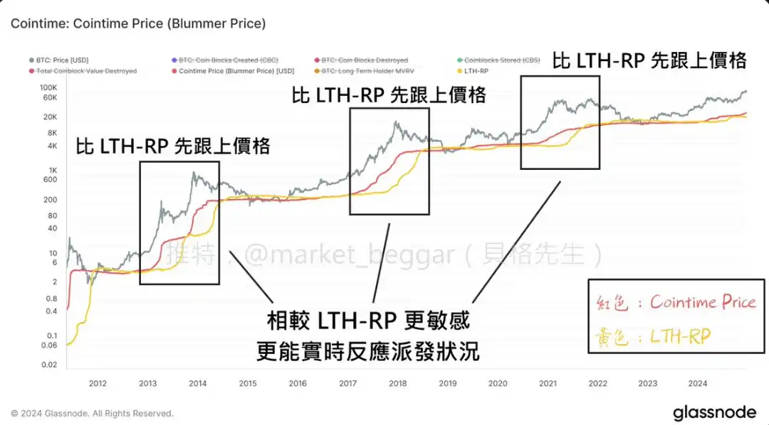 如图三,每次市场主升浪到来之前,Cointime Price 总是比 LTH-RP 更早反应,更能实时体现筹码派发行为的出现。