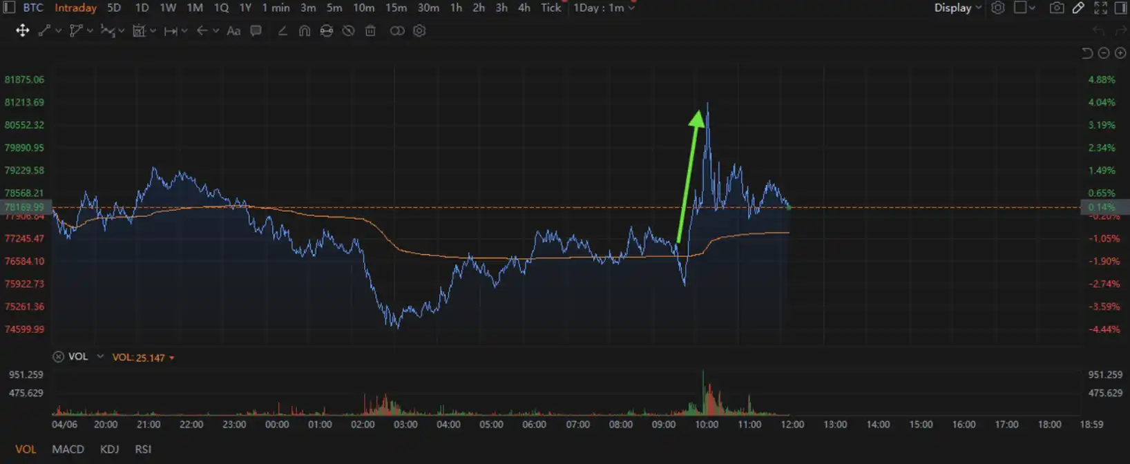 4 月 7 日,时间正值美国股市连跌三天的低迷时刻。美国东部时间上午 10 点 10 分,一条传言突然冒出:白宫正在考虑「暂停 90 天关税」。消息一出,市场瞬间躁动。仅仅 5 分钟后,10 点 15 分,CNBC 报道称,特朗普正考虑对除**以外的所有**实施为期 90 天的关税暂停。这一**性新闻让投资者热血沸腾。到了 10 点 18 分,标普 500 指数从低点飙升,市值暴增超过 3 万亿美元,市场仿佛嗅到了久违的牛市气息,投资者纷纷猜测这是特朗普政策转向的信号。同时,比特币从 76000 美元在短短 10 分钟时间内,上涨至 81000 美元。市场做**绪非常一致,导致 1 小时内合约空单爆仓超 1.29 亿美金。