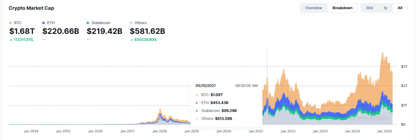 本轮牛市阶段,稳定币的市值整体涨幅达到了 80%,但同期的山寨币的总体市值涨幅仅为 38.3%,增长幅度约为 1599 亿美元。
