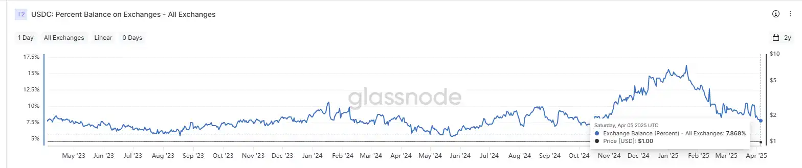 但同期的 USDC 情况却大不相同,2024 年 1 月 1 日,USDC 的交易平台持有量约为 20.6 亿枚,到 2025 年 4 月 2 日,这一数字增长至 49.8 亿枚。同期的 USDC 发行量增发了 368 亿枚,新增的发行量当中,只有 7.9% 流入了交易平台。而交易平台的总体余额占比也仅为 8.5%,与 USDT 的 28.4% 相比有较大差距。