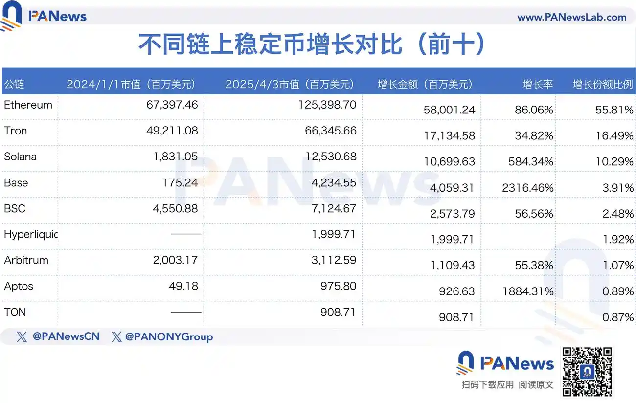 其中以太坊的从 2024 年 1 月 1 日到 2025 年 4 月 3 日的稳定币增量约为 580 亿美元,增长率达到 86%,基本与 USDT、UDSC 的发行增长率相差无几。Tron 的增长率约为 34%,不及稳定币的整体增速。