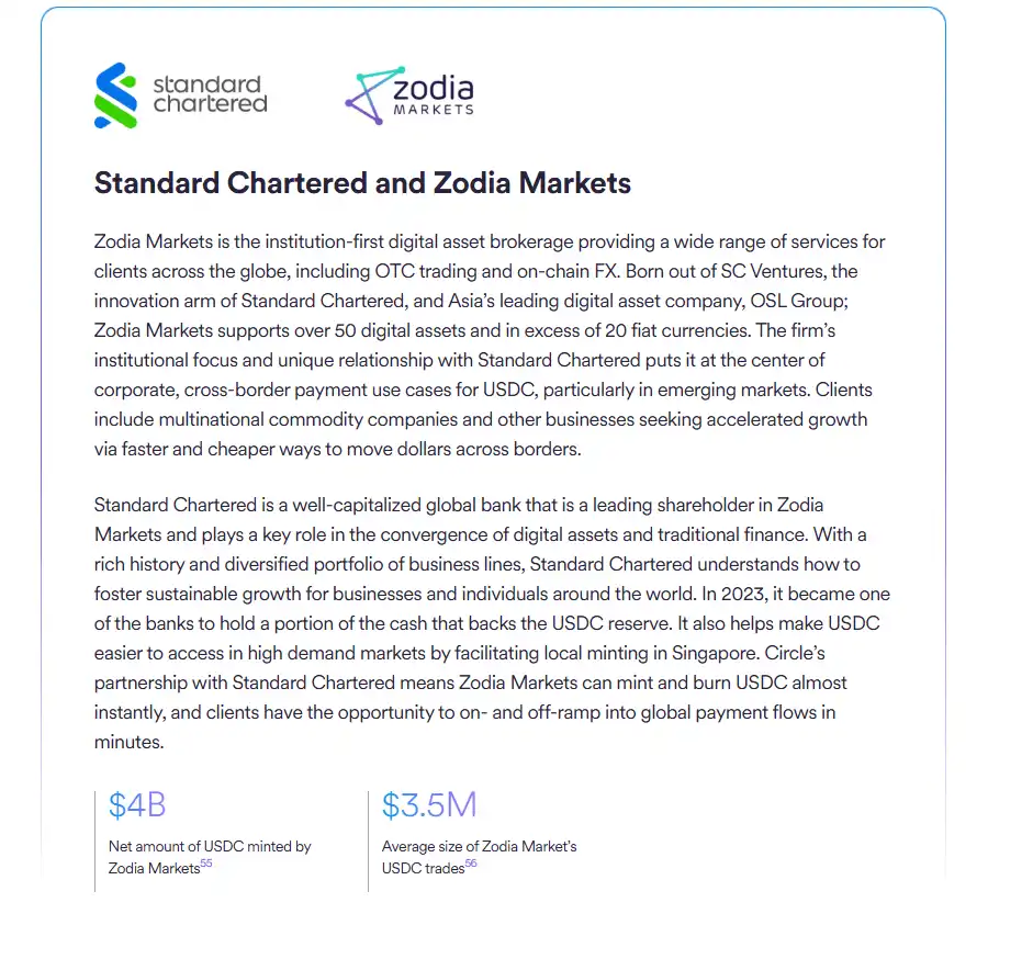 根据 Circle 发布的一份报告显示,2024 年渣打银行旗下的 Zodia Markets 铸造的 USDC 净额已达到了 40 亿美元,(Zodia Markets 是机构数字资产经纪公司,为全球客户提供包括场**易和链上外汇等服务)。