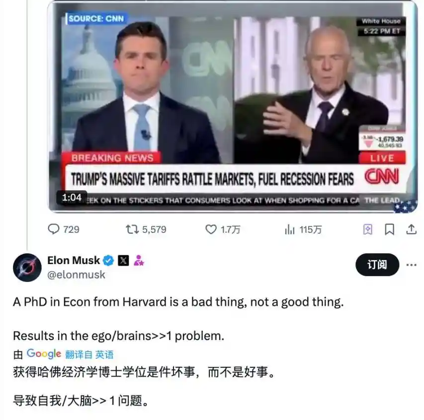 就连与特朗普总统相交甚好的马斯克,前几天也在社交媒体上公开表达了对这位总统顾问的批评和暗讽,直言「获得哈佛经济学博士学位不是件好事,可能因过度自负而导致决策失误」;并质疑纳瓦罗从未亲手创造过**实质性成果。