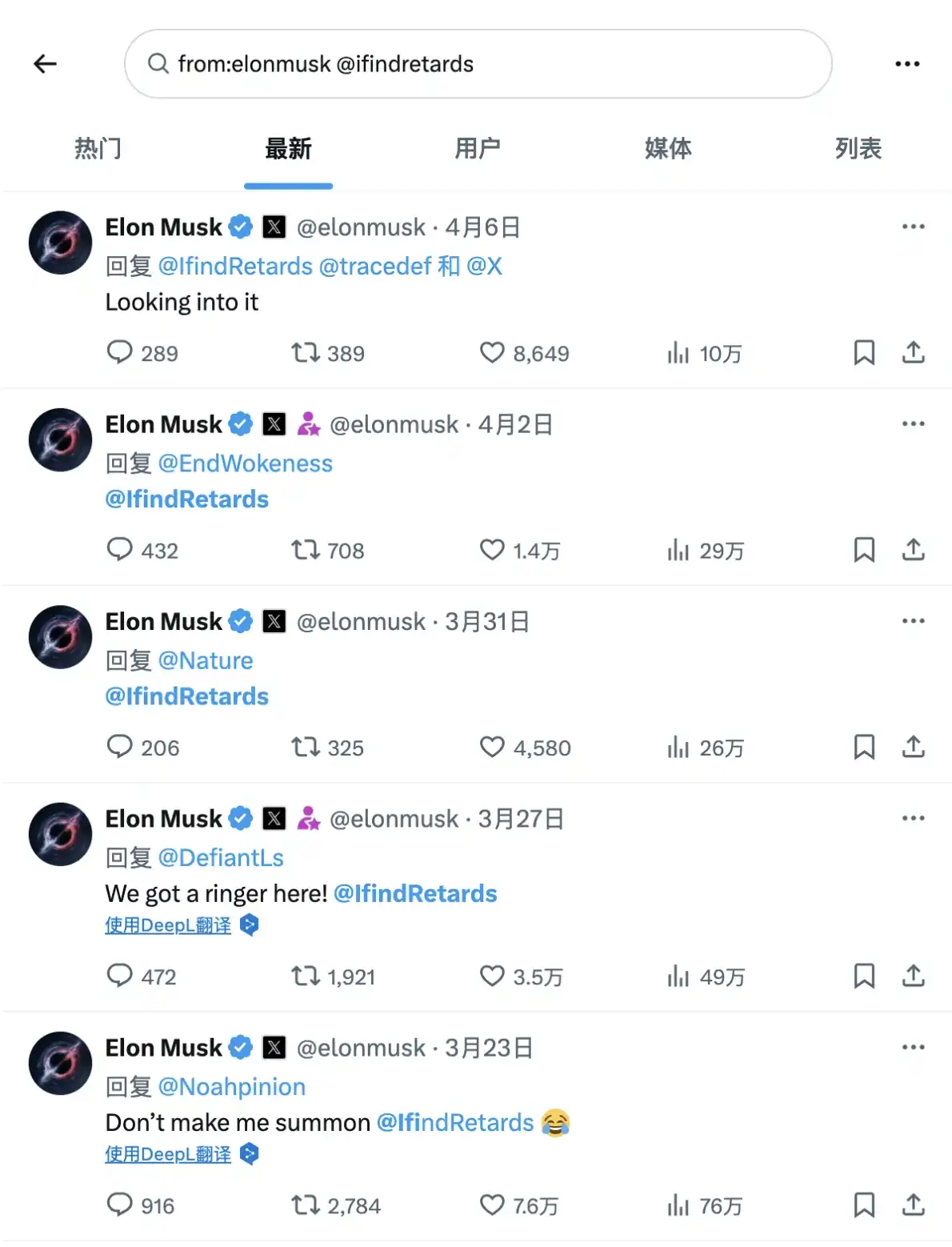 通过在马斯克主页搜索「from:elonmusk @ifindretards」,不难发现这两个账号之间的互动异常**。在过去 35 天内,双方共进行了 22 次互动,其中 11 次为马斯克主动 @ 对方,远超其与特斯拉官方账号(@Tesla)3-5 次的月均互动**。