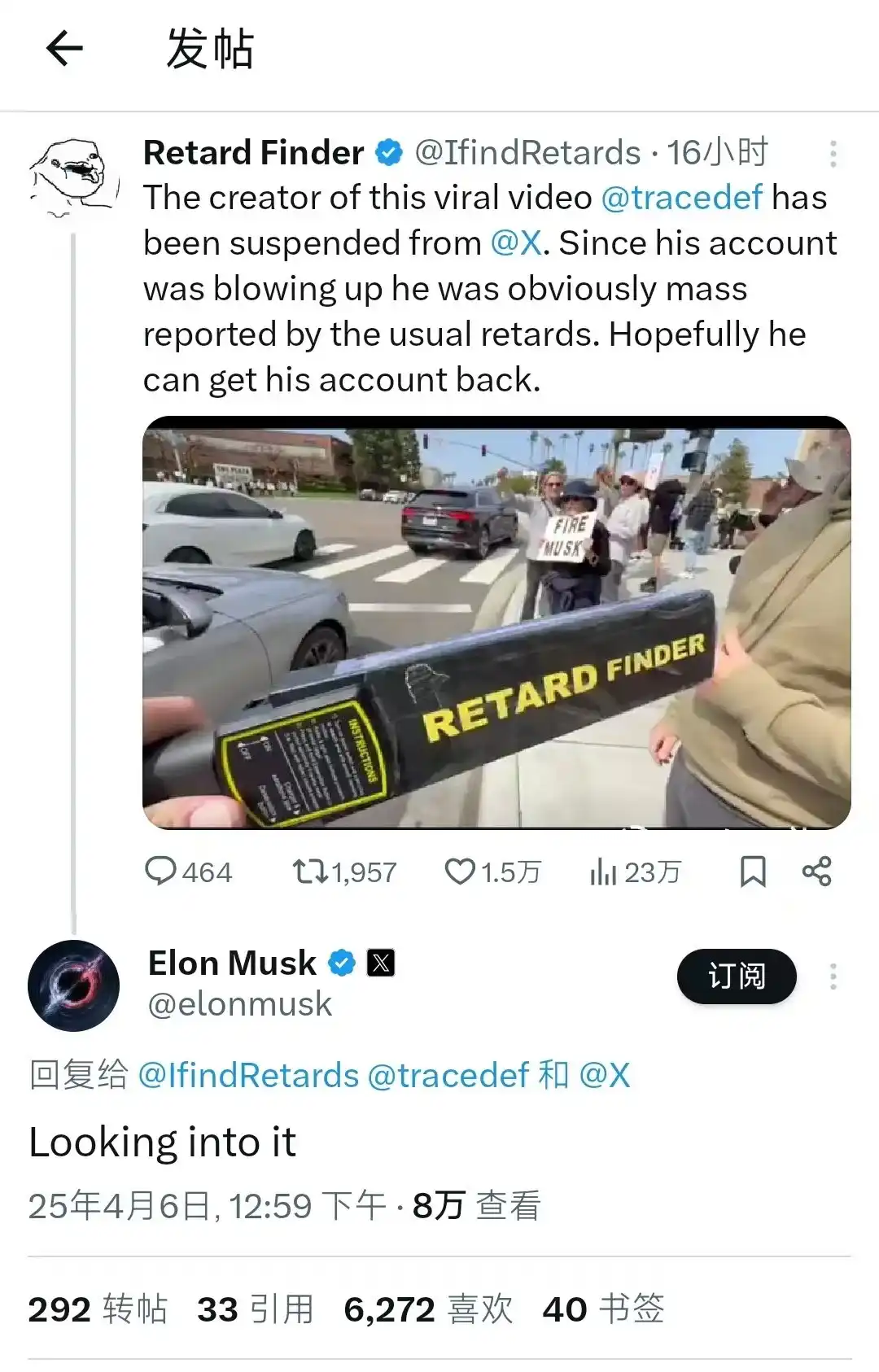 Retard Finder 最初是凭借一则简单而富有讽刺意味的帖子迅速走红:当有人在特斯拉 Cybertruck 上涂鸦**标志时,其仅以一句「Found one」并配上事件截图回应,简练的幽默风格立刻引发广泛传播,也奠定了其「用最少文字揭露荒谬」的风格基调。此后,许多用户自发开始在 X 平台上与 Retard Finder 互动,每当他们发现自己认为的「智障言论」时,都会 @ 该账号; Retard Finder 也会选择性转发这些账号推文,娱乐大众。