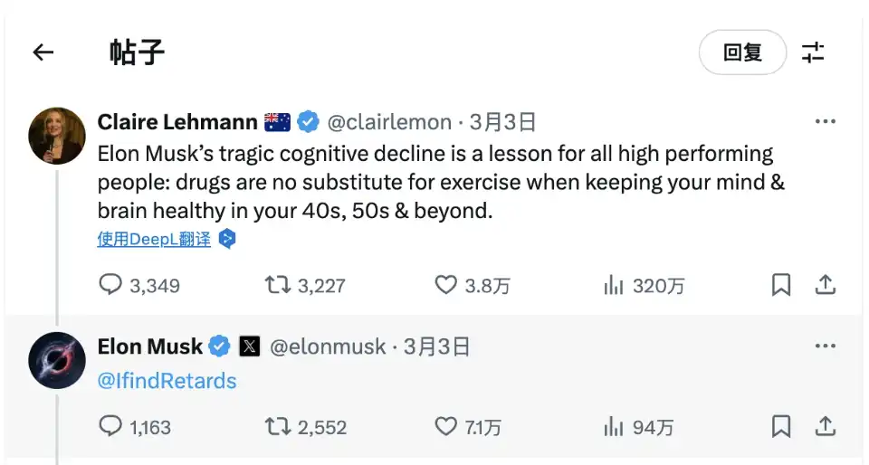 2025 年 3 月,马斯克曾在 X 上回复一则批评他「认知能力下降」的帖子时,直接 @ 了该账号。此前,Quillette 创始人 Claire Lehmann 曾发帖称马斯克依赖**而非锻炼来保持头脑清醒,马斯克则以轻描淡写的方式 @IfindRetards,仿佛在暗示「我找到了一个**」。这一互动不仅让该账号曝光量激增,也被视为马斯克对其「troll 文化」的默许和认可。