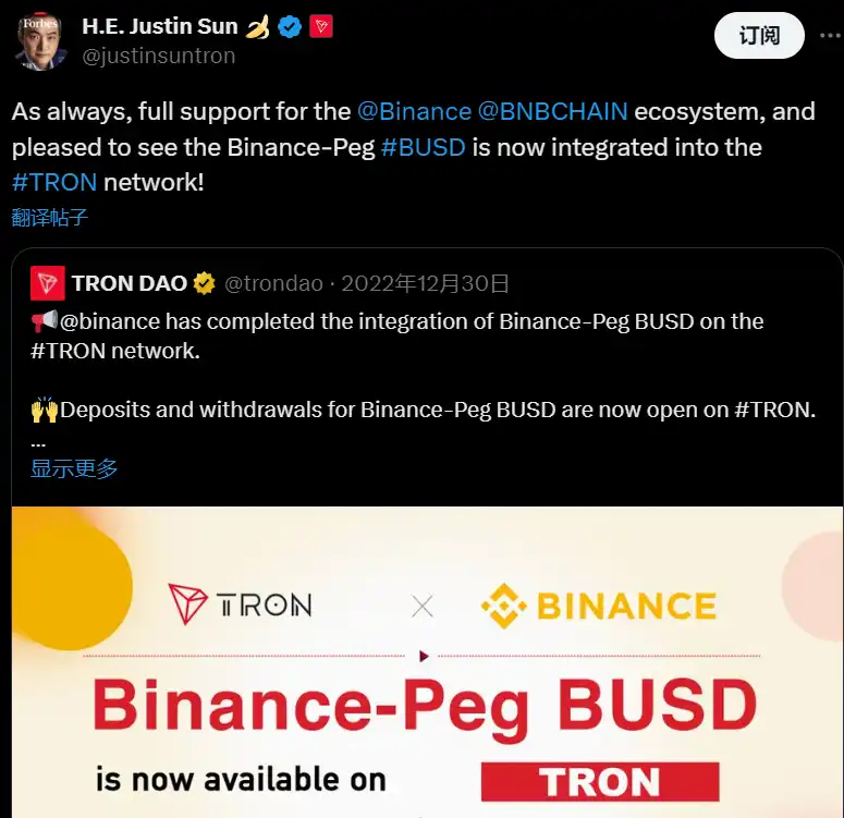 在 HUSD 下架的两个月后,2022 年 12 月 30 日,Binance 宣布已在 TRON 网络上完成 Binance-Peg BUSD 的整合,BUSD 的存款和取款现已在 TRON 网络上开放,孙宇晨也在 Twitter 上积极转发宣传与 Binance 的合作。无论此前二人私下是否因为稳定币合作产生龃龉,至少现在看来,一切还是欣欣向荣一派和谐的景象。