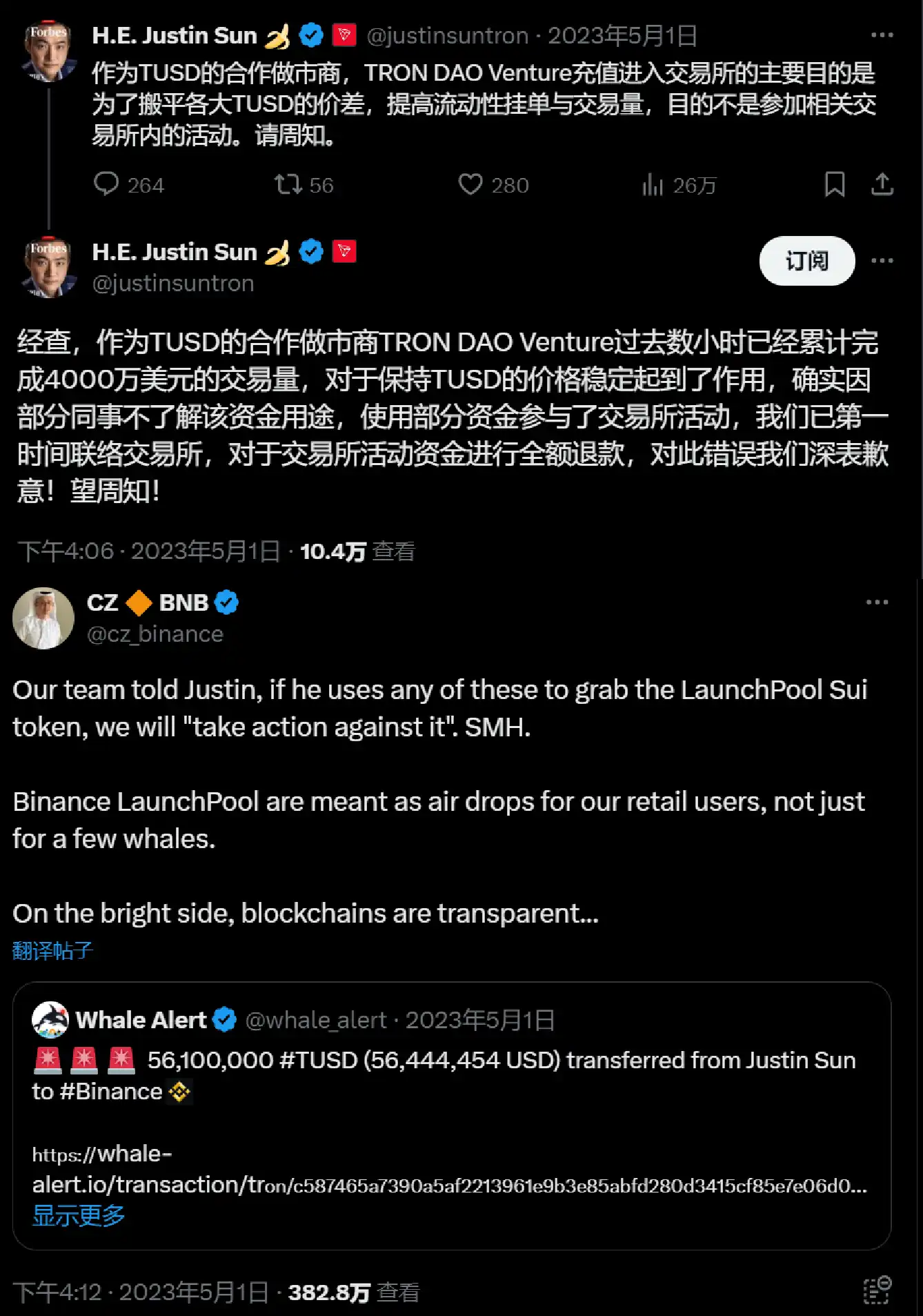 2023 年 5 月,孙宇晨将 4.05 亿枚 TUSD 转入 Binance,疑似用于参与 Binance LaunchPool 的 SUI **挖矿活动。这引发币圈社群的争论,认为这像是 CZ 在帮助巨鲸,通过 Binance 交易所的矿池激励,让孙宇晨通过原本的巨额资金取得新** SUI,社群指控这样的行动涉嫌「内幕交易」。随着**的发酵,孙宇晨回应称,转账最初目的是作为 TUSD 做市商「搬平价差」,提升流动性,并非参与活动,而对于由于失误参与了活动的部分资金已联系交易所进行退款。随后,CZ 也公开表态称,若孙宇晨使用这些 TUSD 参与挖矿,将对其采取行动,并强调 LaunchPool 是为零售用户而非「鲸鱼」服务。一场 4.05 亿美元的闹剧也在两方老板的免责声明中告一段落。