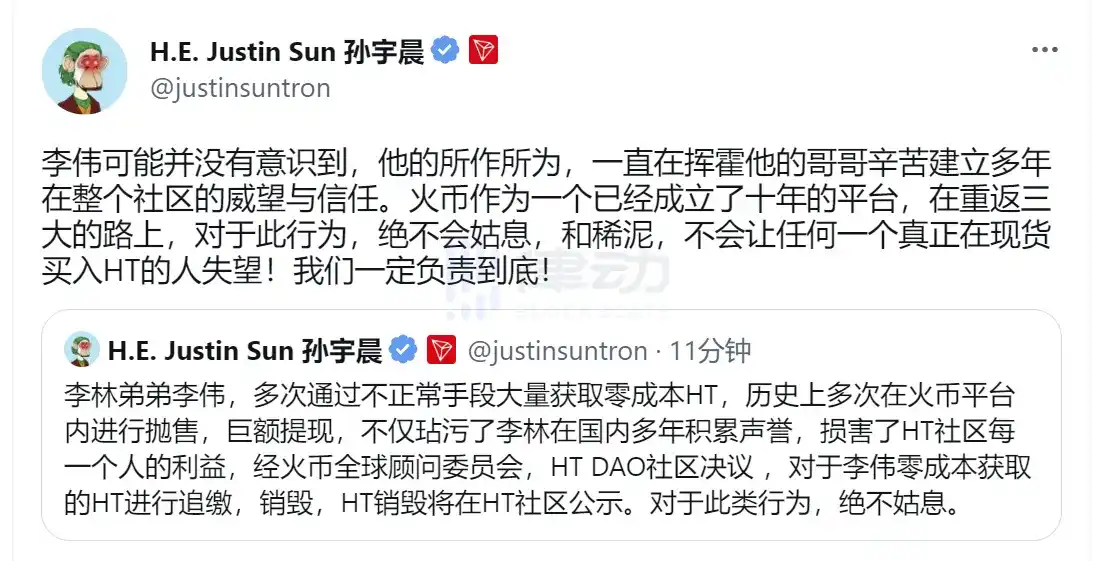 2023 年 5 月,孙宇晨发文,指责李林的弟弟李伟多次通过不正当手段大量获取零成本 HT 并抛售,并表示为了保护 HT 社区的权益,要追缴销毁这些**。随后,火币创始人李林在朋友圈进行了回应,表示希望对方提供证据,如果确认李伟是通过不合法的手段获取的零成本的 HT,他愿意以个人名义赔付 10 倍的 HT 给 Huobi 公司;如果不属实,希望 Huobi 归还用户合法资产。