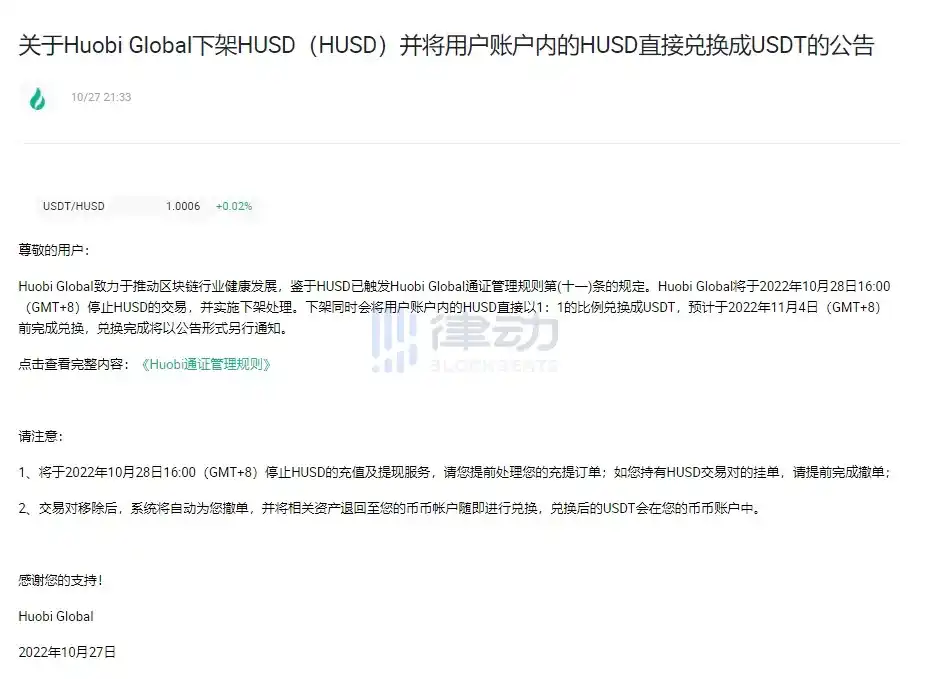 BUSD 的顺利发行与大获成功,使得 CZ 借助平台优势,一步步打造着自己的加密帝国。在 Binance 宣布兑换计划仅一个月后,2022 年 10 月 28 日,刚被孙宇晨接手 20 天的 Huobi Global 发布公告,HUSD 触发 Huobi Global 通证管理规则第(十一)条规定,将于当日停止 HUSD 的交易并实施下架处理,用户账户内的 HUSD 直接兑换成 USDT。此消息一出,市场哗然,HUSD 失去挂钩,价值迅速下跌,于 11 月 1 日跌至 0.3 美元,此后一蹶不振,**退出稳定币竞争市场。