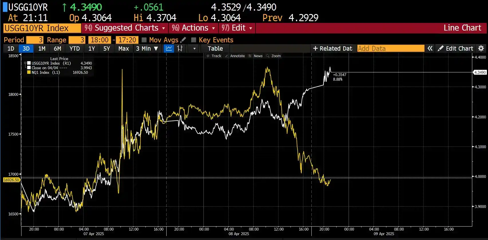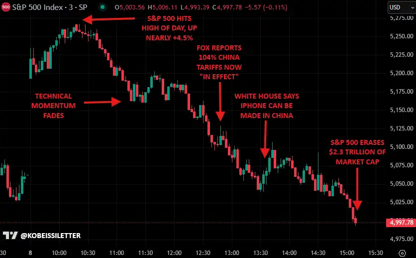 **失败,市场并没有等来好消息。今日凌晨,白宫新闻秘书表示对**的 104% 的额外关税已于东部时间中午生效,全球金融市场再次跳水。