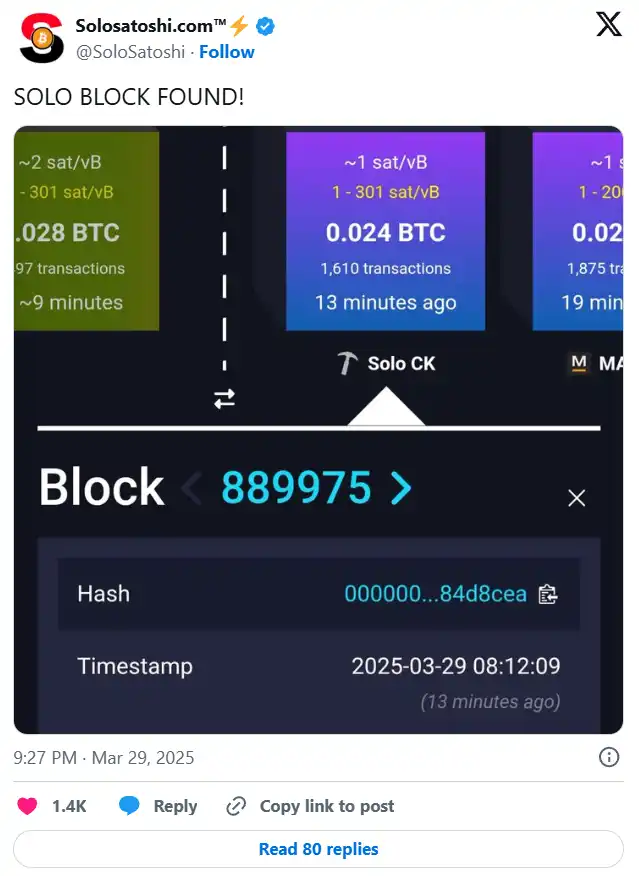 值得注意的是,Solo CKPool 并不是传统意义上的矿池。尽管名字中有「Pool」,但它只是提供一个接入点。矿工一旦找到区块,就可以自己拿走绝大部分奖励。不过,这并不代表通过 Solo CKPool 挖出区块的就是一个人坐在他的卧室用极低的算力挖出来的。X 上有些人对此误解较大,甚至在没有数据支持的前提下大肆鼓吹这一观点。