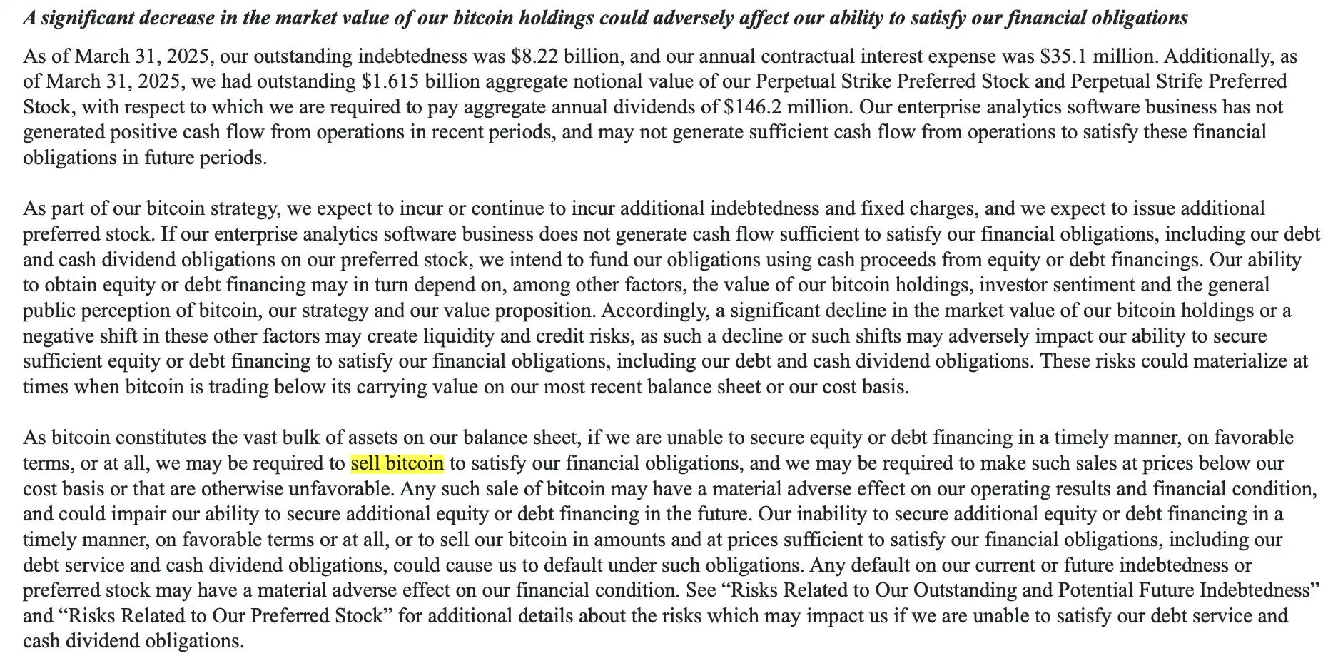 同时,现金流危机也让公司如履薄冰。Strategy 的核心业务——数据分析软件,已连续多个季度无法带来正向现金流。然而,公司每年还得支付 3,510 万美元的债务利息和 1.46 亿美元的股息,总计 1.813 亿美元。如果外部融资跟不上,卖出比特币几乎是**的出路。文件提到,82.2 亿美元的债务(截至 2025 年 3 月末)让偿还压力如山,若市场环境恶化,公司甚至可能被迫以低于成本价的「亏本价」抛售。