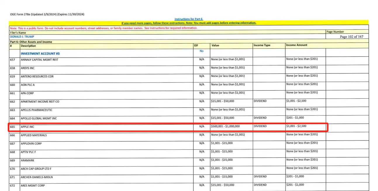 除此之外,特朗普还持有大量科技巨头股。根据联邦选举委员会(FEC)的规定,总统候选人必须在每年 5 月 15 日前提交个人财务披露报告,涵盖其资产、负债和收入来源,包括股票投资等,特朗普作为总统候选人,需遵守此规定进行披露。其**披露的 2024 年报告显示,特朗普持有苹果、微软、英伟达、亚马逊、Alphabet(谷歌)、Meta Platforms、伯克希尔哈撒韦、百事可乐、摩根大通等股票,价值范围从 10 万美元到 100 万美元不等,其中苹果、微软和英伟达的持股价值均超过 50 万美元。仅上述股票价值总额就在 225 万到 475 万美元,若特朗普在披露后 8 个月内并未大幅变动股票仓位,暴跌将对其账面财富产生不小的冲击。
