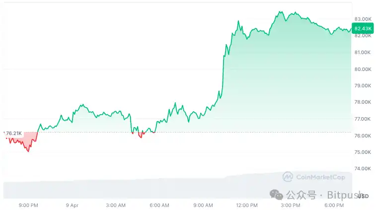 传统金融市场同样迎来久违的狂欢。标普 500 指数单日** 9.5%,创下 2008 年金融危机以来的**单日涨幅。道琼斯工业平均指数和纳斯达克综合指数也分别上涨 8.2% 和 10.1%。加密货币相关股票表现尤为亮眼,Coinbase 股价飙升 17%,微策略大涨 24%。
