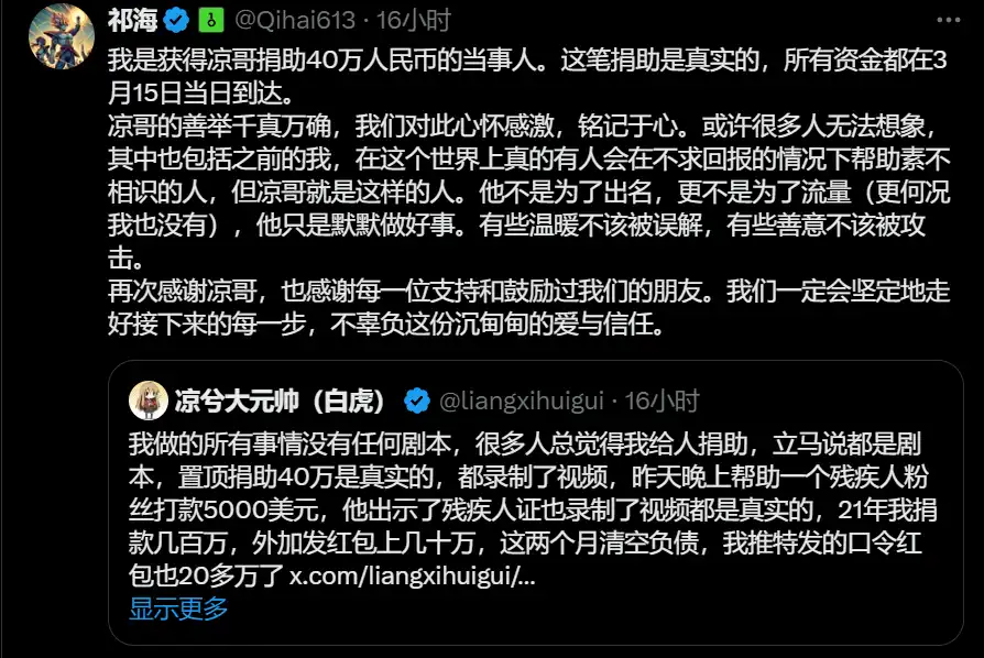 当有**疑这是「剧本」时,受资助的当事人站出来表示,凉兮确实资助了他 40 万人民币,所有资金在 3 月 15 日已经**到达。