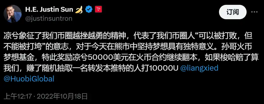 2022 年 10 月 17 日晚,波场创始人孙宇晨与火币联合创始人杜均加入凉兮的 Twitter Space ,宣布各为凉兮无条件提供 5 万美元交易资金,让他在火必合约开单。尽管这 10 万美元的资金在不久后就归零,但这场 Space 吸引了大量用户,同时在线人数超过 9000 人,创下中文加密推特记录,更是登上了推特全球实时 Space 排行**。孙宇晨称赞凉兮:「凉兮象征了我们币圈越挫越勇的精神,代表了我们币圈人『可以被打败,但不能被打垮』的意志,对于今天在熊市中坚持梦想具有独特意义。」