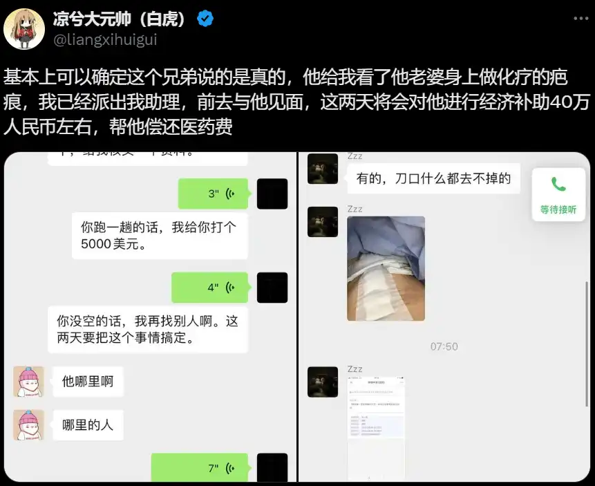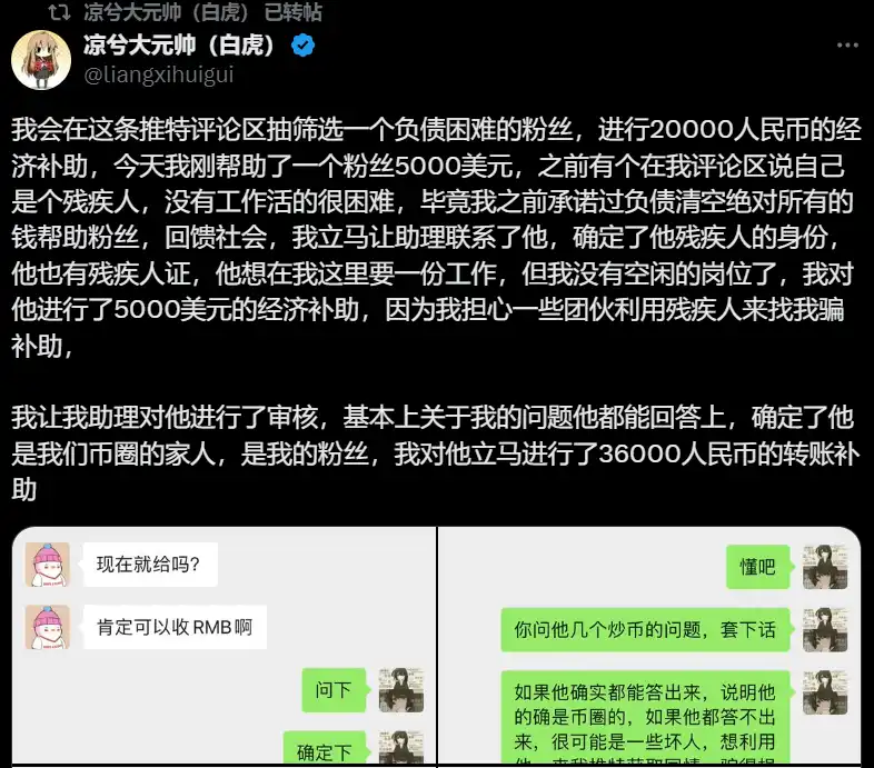 凉兮充满反差感的另一面就是,他有钱后愿意帮助有困难的人。25 年 3 月 10 日,一位网友在 Twitter 上公开求助,希望有人可以帮帮他得了罕见癌症的妻子。凉兮看到后马上转发并表达愿意资助的态度,并在核实过事实无误后拿出五万美元(折合人民币 40 万左右)对这名网友进行报销医药费外加经济补偿。3 月 15 日,凉兮发了一条情况跟进视频,视频中他说,「不止是四十万的补助,后续**医药费我**负责,外加他的爱人如果情况有好转,我将资助他们去马尔代夫旅游或者其他旅游**,我全额报销!」