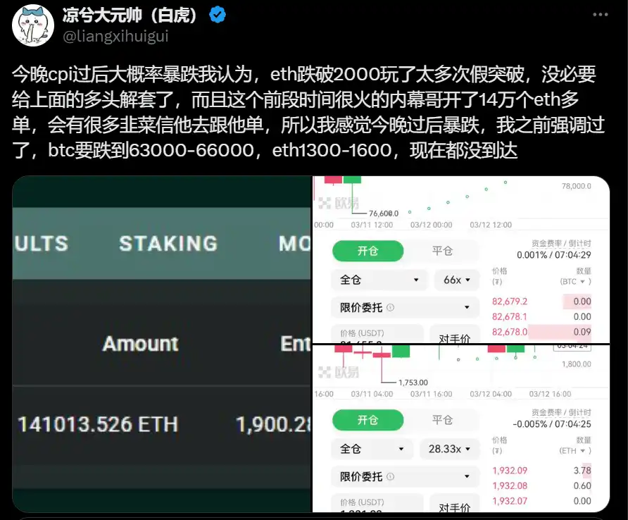 故事的转折发生在 2025 年。2025 年 2 月 24 日,比特币暴跌至 8.6 万美元,** 40 万人爆仓,凉兮以 2000U 通过 50-100 倍杠杆双向操作 ETH,在宽幅震荡行情中高频交易,先做空后做多,单日收益超 100 万 U,一举震惊市场;2025 年 3 月 10 日,在比特币 8.9 万美元震荡行情中,凉兮再次以 2000U 本金开 100 倍杠杆,抓住短线活跃,一夜狂赚 800 万美元,在社交媒体引发「凉神归来」热潮。