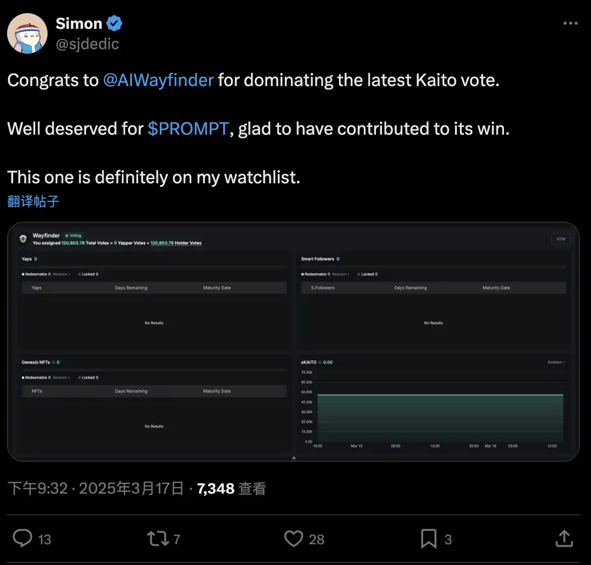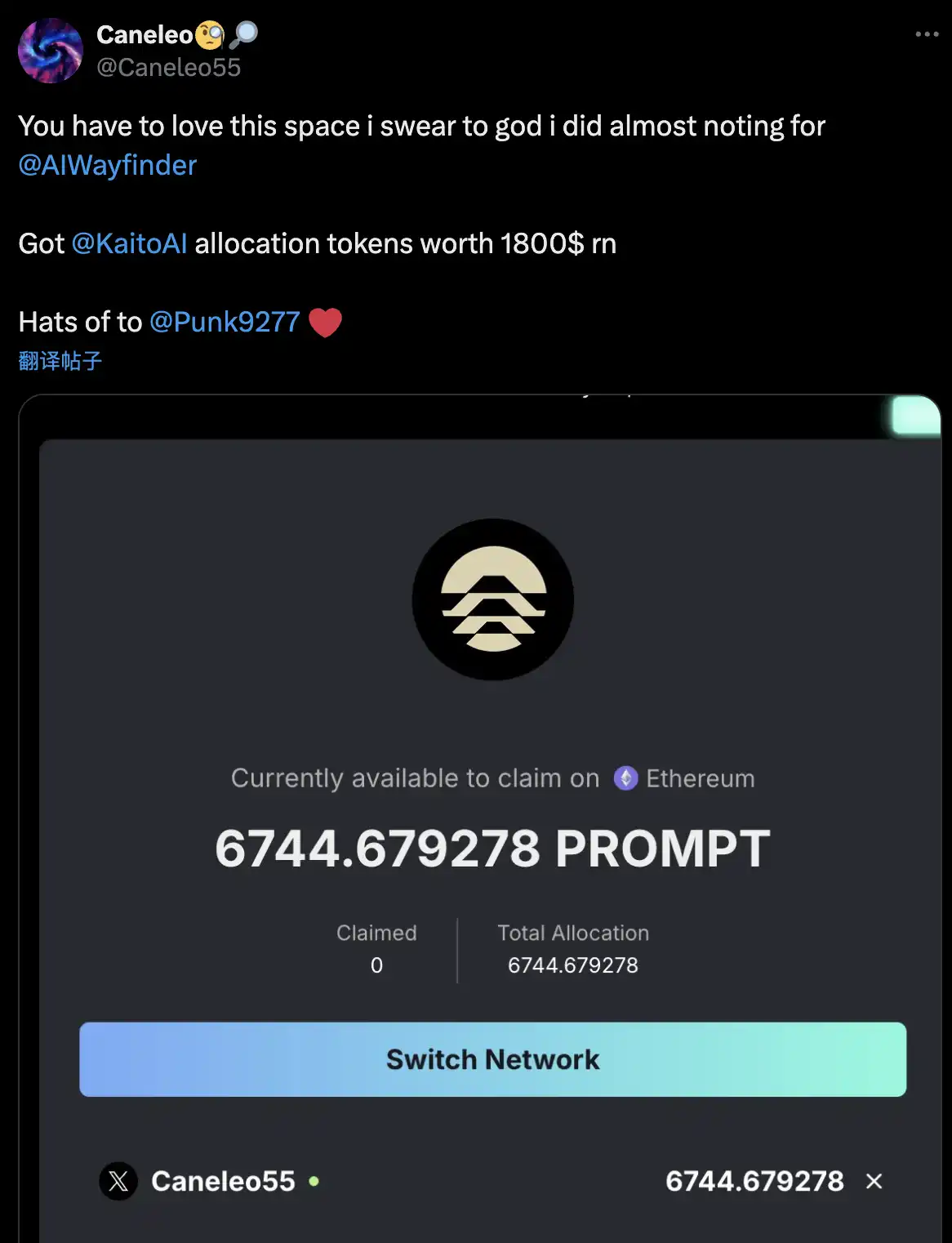 甚至许多收到空投的人都看不下去,为此发声,Moonrock Capital 的创始人 Simon 发文提到自己在 Kaito 与 AIWayfinder 的空投页面得到了价值接近 1 万美元的$PROMPT,并表示不知道为什么 AIWayfinder 会奖励自己,即使自己几乎没有提到过这个项目。