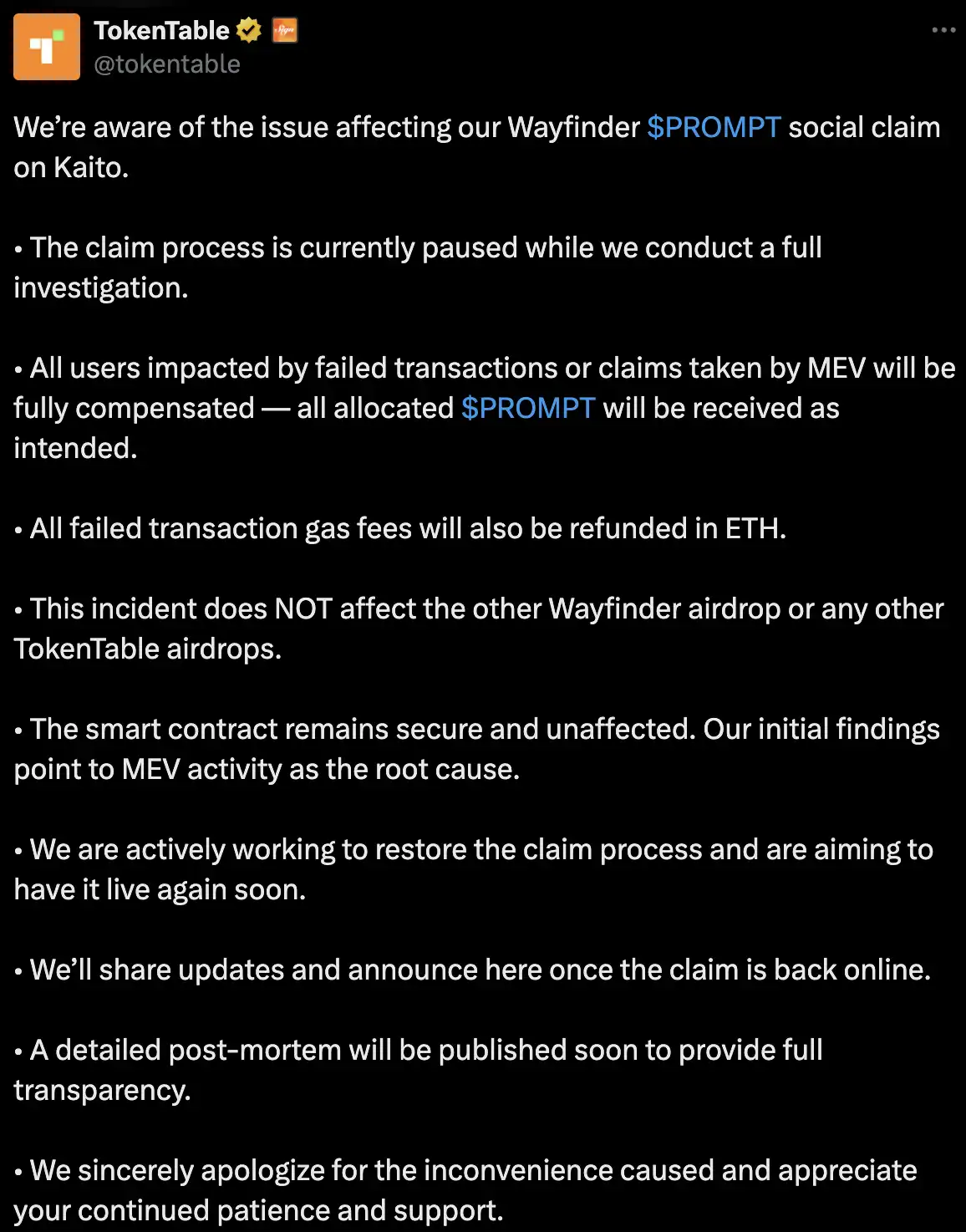 负责本次 KAITO 空投的技术支持平台 TokenTable 也快速的做出反应,表示此事件不会影响其他 Wayfinder 空投或**其他 TokenTable 空投,将补偿所有在这次空投中因 MEV 影响没有收到**的用户的损失,包括所有失败的交易费用也将以 ETH 形式退还。并提到智能合约并没有问题,MEV 是根本问题。我们从官网可以得知 TokenTable 的合约是由 tteSec、Nethermind、TonTech 这些审计公司负责的。