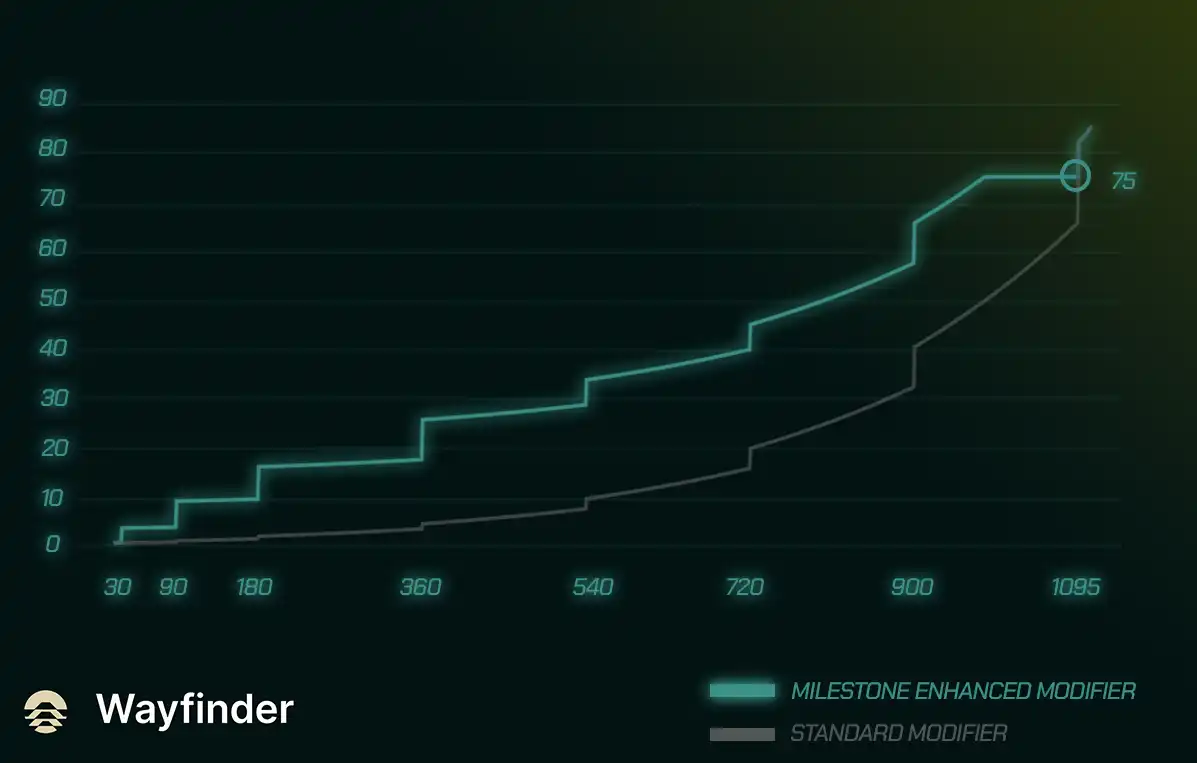 2024 年 6 月 Wayfinder 发布了一个活动,质押$PRIME 获得参加 Wayfinder「未来空投」的机会,而随着你质押的时间越长获得的奖励也越多,最长的质押期为三年。