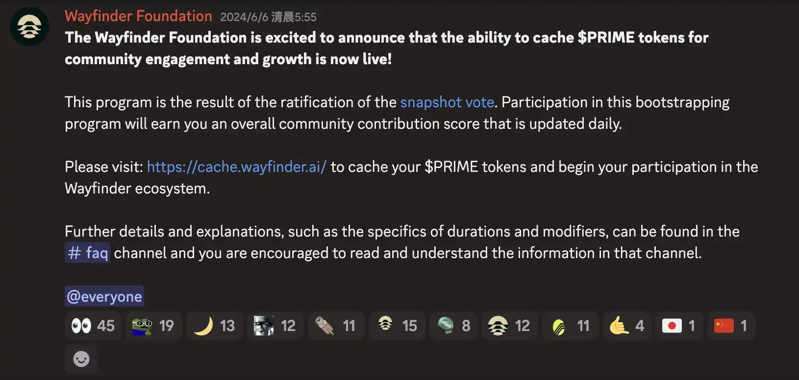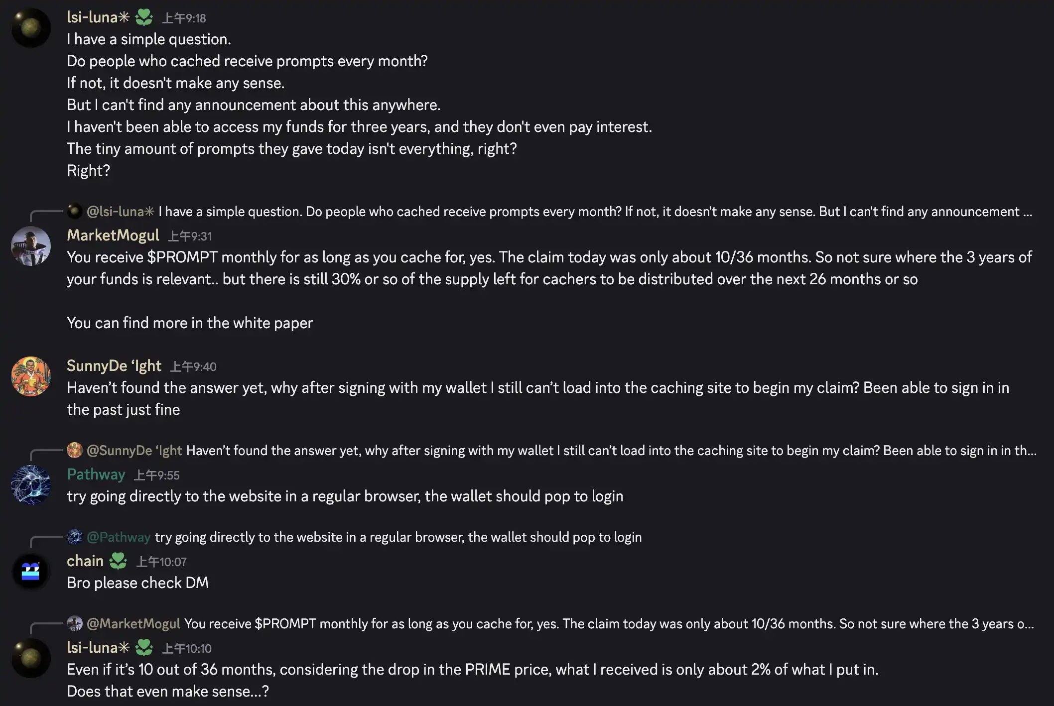 Kaito 与 WayFinder 的空投处理刚刚得到解决方案,另一方面当初质押$PRIME 成为 Cache 的用户却苦不堪言,社区成员 Lsi-luna 正是参与活动的其中一人,他在 Discord 发出了灵魂拷问,「即使这次的空投领取的是其中的一部分,参考到$PRIME 价格的暴跌,我收到的仅是我投入的 2%」