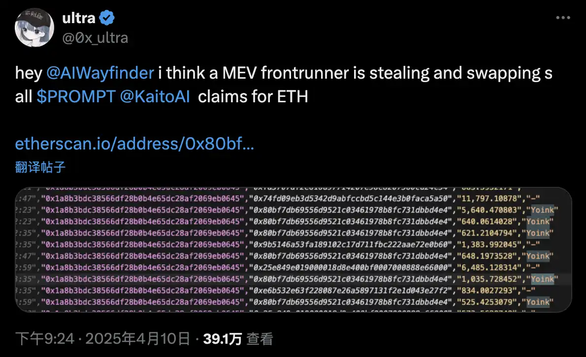 正当大家迷惑之际,开发者 Ultra 在社交平台 X 上向 Wayfinder 喊话,MEV Frontrunner 正在偷取在 KAITO 活动页面兑换的 $PROMPT 并兑换成 ETH。并自嘲自己之所以这么快发现是因为也被「Yoinked」了。