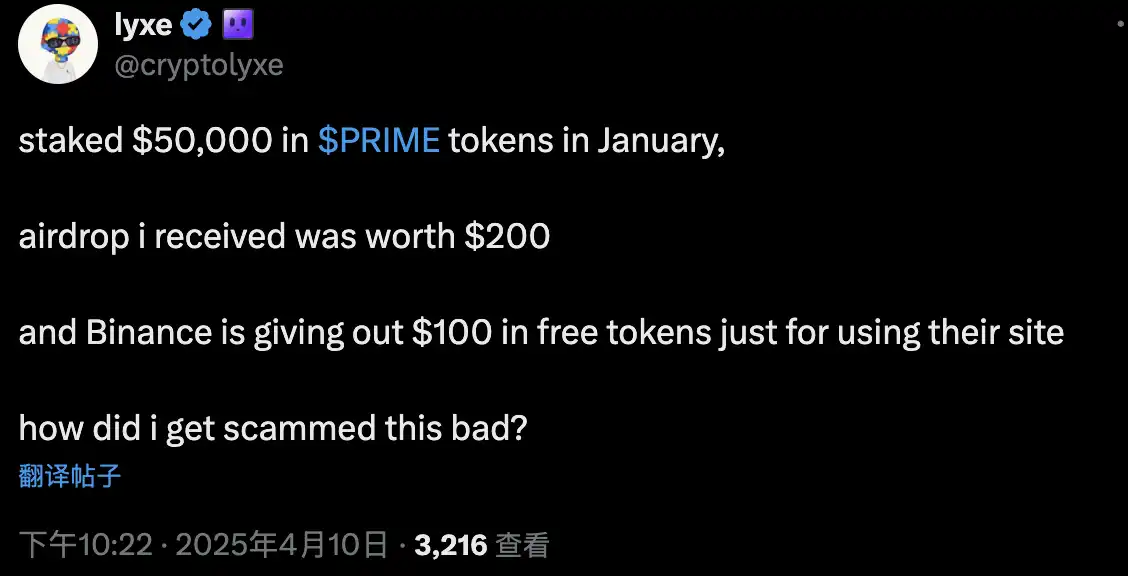 事实上这个情况在许许多多区块链项目中已经发生过无数次了,但真正让社区心寒的是,是从 1 月质押了 5 万美元的$PRIME,到现在仅能获得 200 美元,而光是币安的一次使用网站功能的活动就能免费获得 100 美元。对贡献者的藐视和对非贡献者的慷慨让他们**气愤。