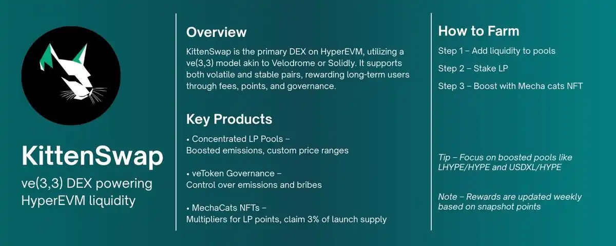 KittenSwap 是 HyperEVM 上的主力 DeX,采用类似 Velodrome 和 Solidly 的 ve(3,3) 模型。它支持稳定币和波动性**交易对,并通过手续费分红、积分计划和治理机制奖励长期用户。