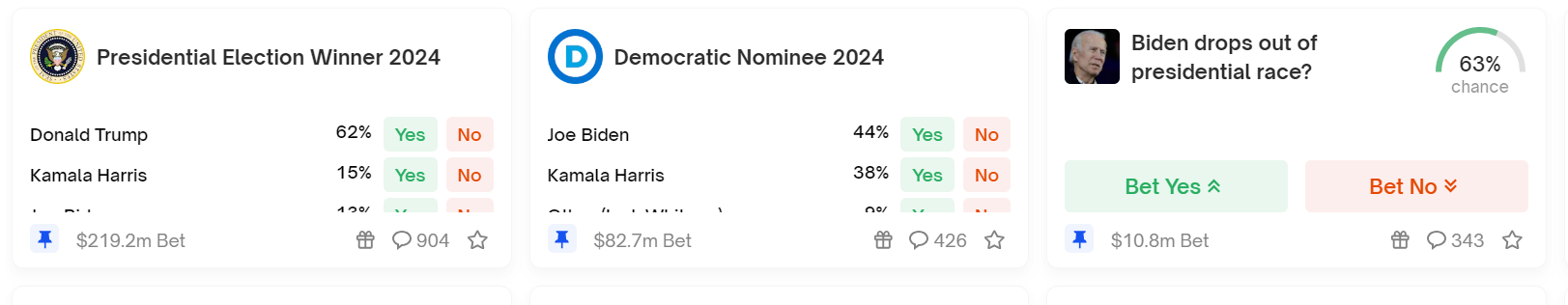 而在“2024年民主党候选人”的预测中,哈里斯的胜率已升至38%,而拜登的概率降至44%,目前该预测的赌注达8270万美元。