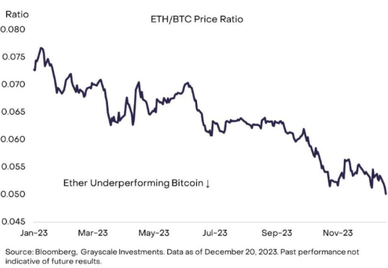 很少有人会说上涨 82% 的资产「表现不佳」,但以太坊的** ETH 在 2023 年的表现就是如此。作为第二大加密资产,以太坊在今年取得了丰厚的回报(价格波动性相对较低),但升值幅度仍明显低于比特币,后者今年涨幅有望达到 162%。ETH/BTC 的价格比全年都在下降,达到自 2021 年中期以来**水平。