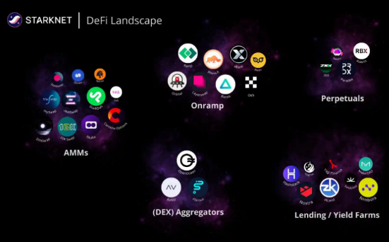 近日,官方更是发布了下面显示了 Starknet 网络 DeFi 主要应用的图,本文参考官方的推文,从跨链桥、AMM/DEX、聚合器、借贷、衍生品五个赛道具体介绍 Starknet 有那些 DeFi 协议值得**关注。