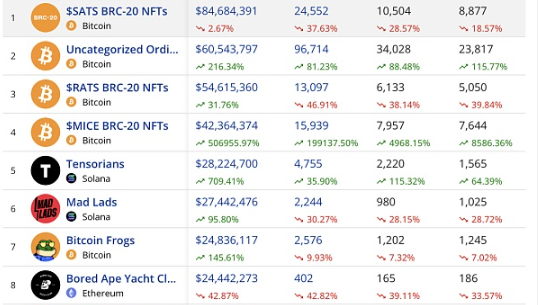 随着这段时间的发展,比特币生态NFT已经**开花。Cryptoslam数据显示,比特币以2.6561亿美元的交易量占上周所有NFT交易的57.25%,而在近30天NFT交易额排名前十中,比特币生态占据7个,现在我们简单了解下比特币生态有哪些热门的NFT。