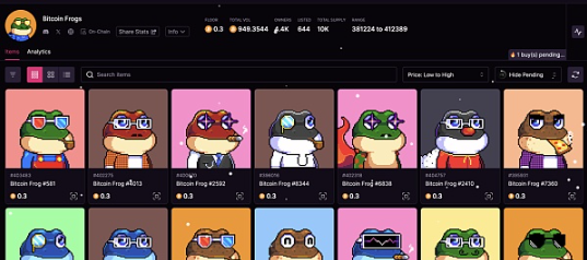 Bitcoin Frogs总量一万,是2023年3月8日推出Bitcoin Ordinals NFT,是目前的比特币赛道 NFT 龙头。