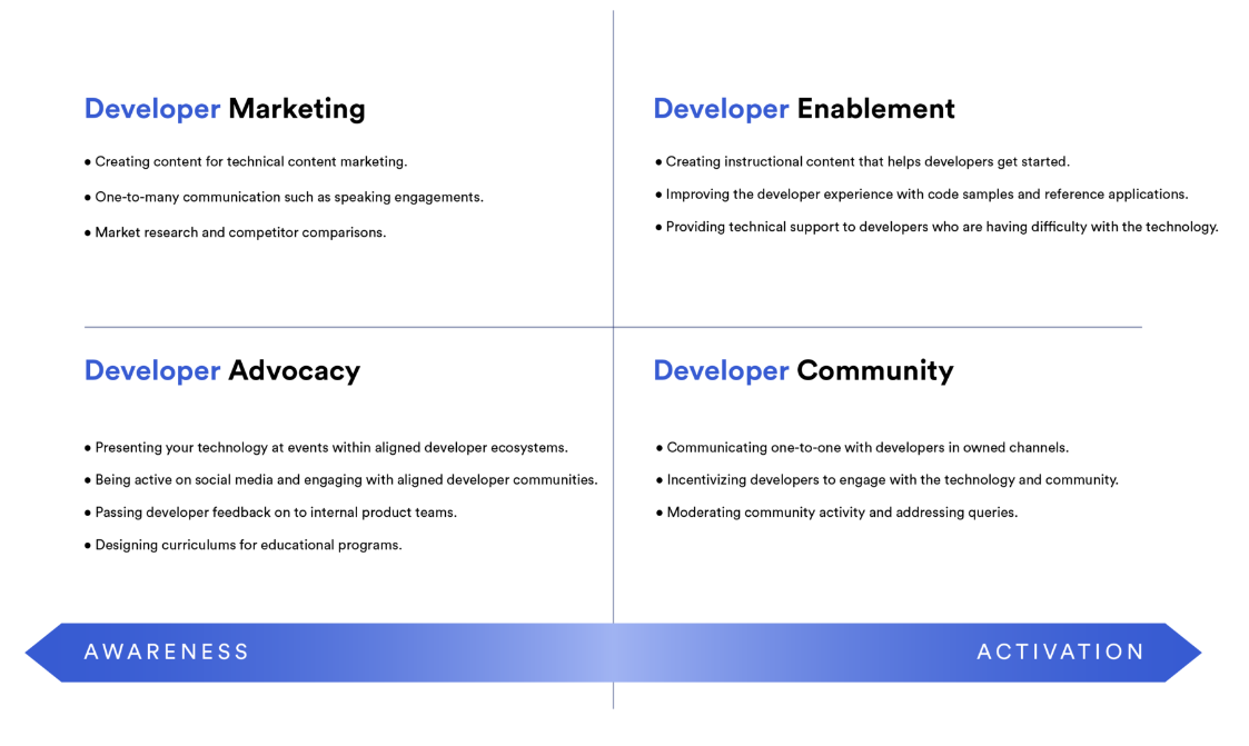 下图强调了DevRel职能通常是如何划分的,并对比了它们的基本目标。