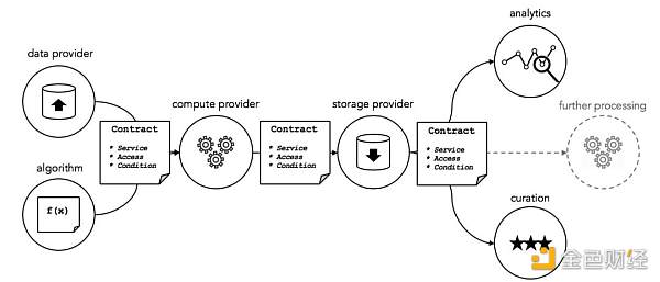 主要的参与角色为数据使用者、服务提供者、市场、服务发布者、验证者和策展人。Ocean 提供了**数据科学工具,数据使用者可以在 Ocean 上建立数据服务管道以自动化运行数据算法从而对数据进行加工处理以及价值发现。在这个过程中,数据使用者无法下载**数据集以及看到**数据集,因此保护了数据集不被盗取,使用者购买的是数据集的使用权,而非拥有该数据集。