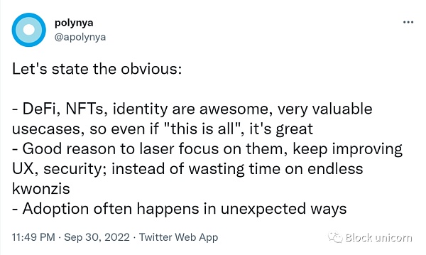 Polynya在上图的推文里**地框定了这篇帖子:到目前为止,我们到目前为止所做的可能就是我们使用区块链所取得的**成果。我们正在研究的技术要么徘徊在改变世界的边缘,要么**停留在书呆子世界的边缘。我们已经成功地吸引了全世界的注意力,但如果我们要采取行动并兑现承诺的话,我们需要迅速转向,否则就会冒着走进我所说的以欧洲为**的加密技术的死胡同的风险。