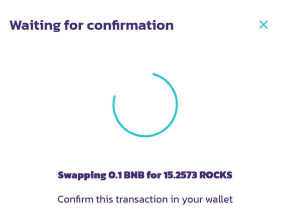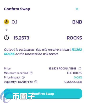 5、要购买ROCKS,请在Swap框上方输入要出售的BNB数量,Pancakeswap将自动计算交易可以获得的ROCKS**数量,确认没有问题之后,点击”SWAP”(本次以0.1枚BNB为例,可兑换15.2573枚ROCKS,价格为实时变化)