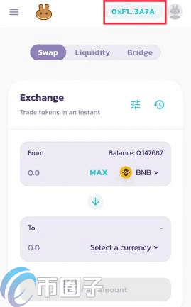 3、钱包连接后,将自动跳转至之前的页面,在右上角可以看到自己的钱包地址时说明已经连接完成,此时的默认币种为BNB。